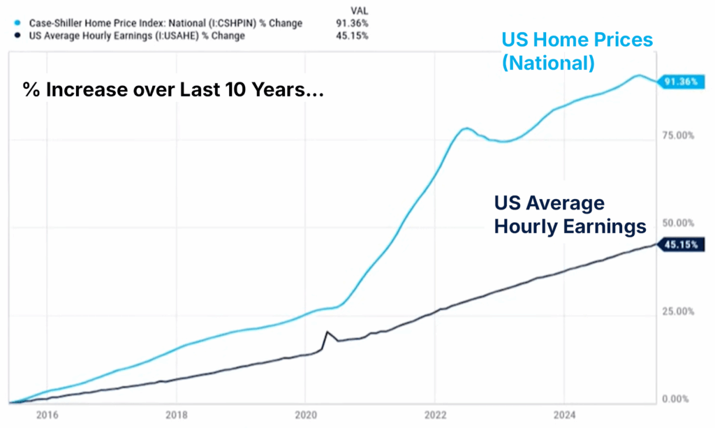 On the demand side, affordability has deteriorated sharply because mortgage rates rose much faster than incomes. Monthly payments became the binding constraint, not home prices alone. That’s why home sales and transaction activity can be depressed even when prices remain resilient.