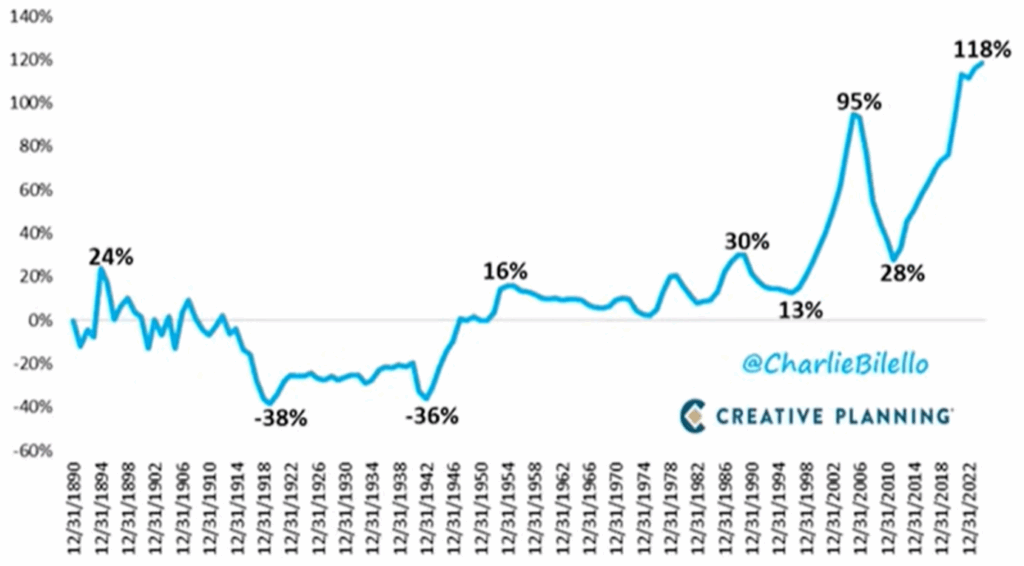 US Real Home Price Appreciation (Adjusted for inflation, Annual Data, 1891-2024). Fonte: Charlie Bilello su X, 6 gennaio 2026.
