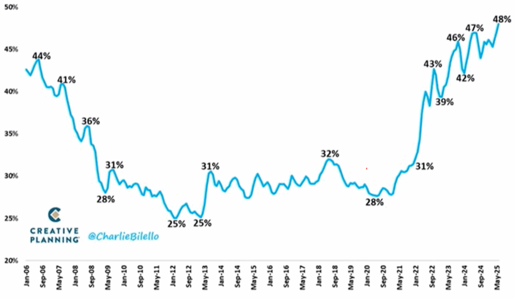 US Median Housing Payment as % of Median income (Note: Payment includes P&I, Taxes, Insurance, PMI) Data Source: Atlanta Fed (as of June 2025). Fonte: Charlie Bilello su X, 6 gennaio 2026.