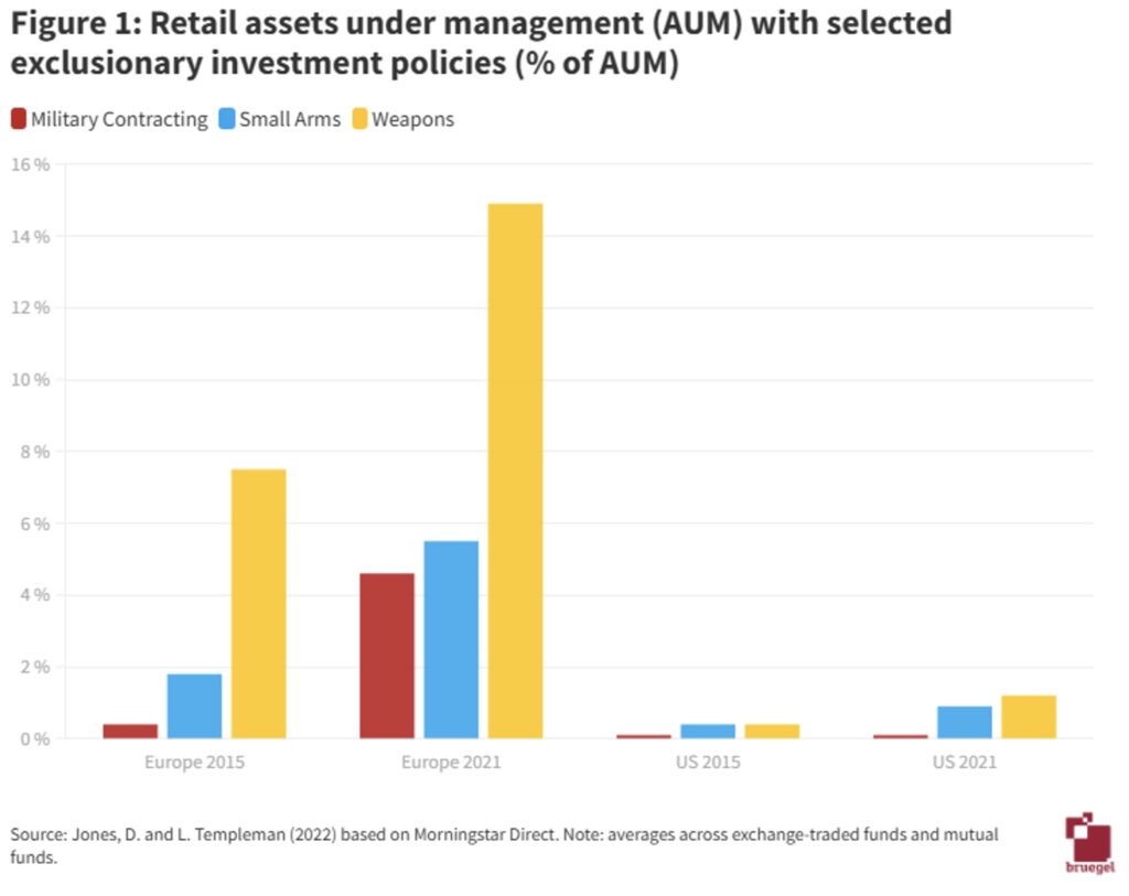 The penetration of investment restrictions targeting the defence sector increased massively across European investment funds between 2015 and 2021 (Figure 1). As of 2021, 14 percent of all retail assets under management in Europe was subject to some restriction on weapons-related investments – a trend not seen in the United States.