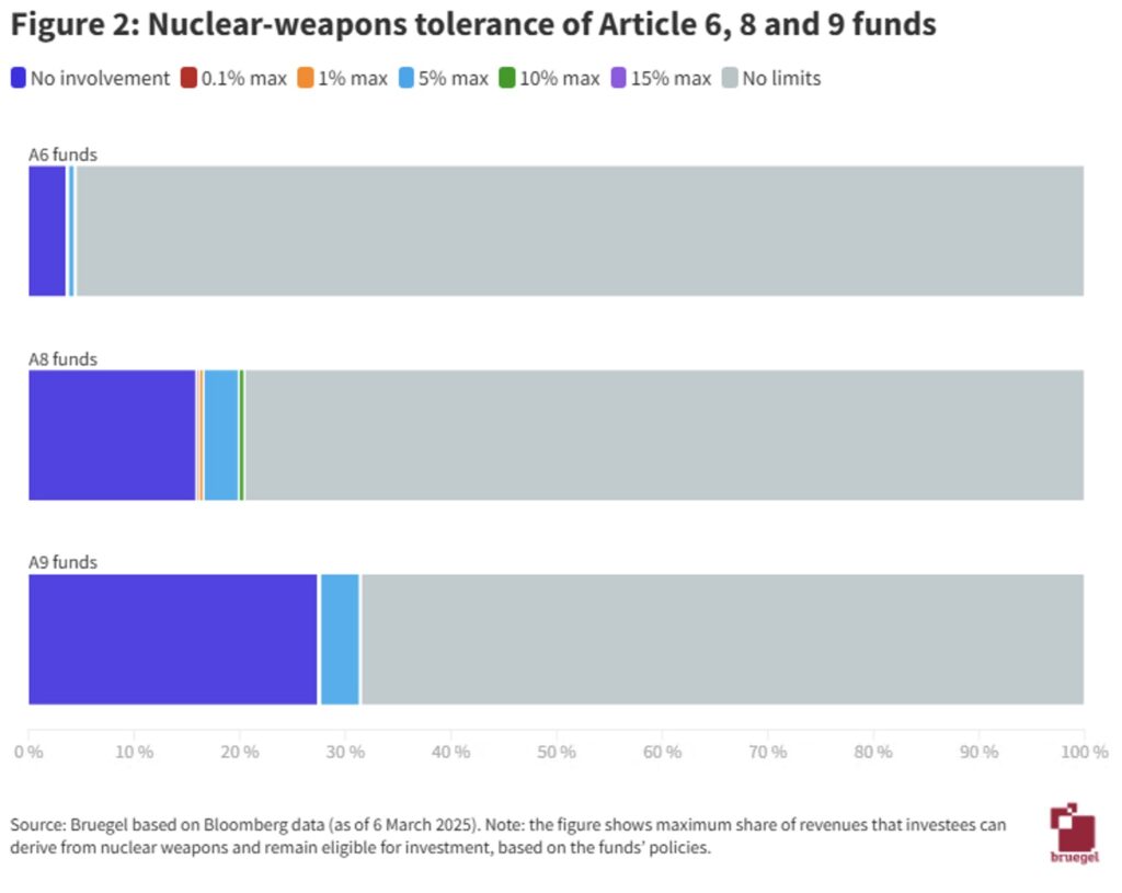 Source: Bruegel based on Bloomberg data (as of 6 March 2025). Note: the figure shows maximum share of revenues that investees can derive from nuclear weapons and remain eligible for investment, based on the funds’ policies.