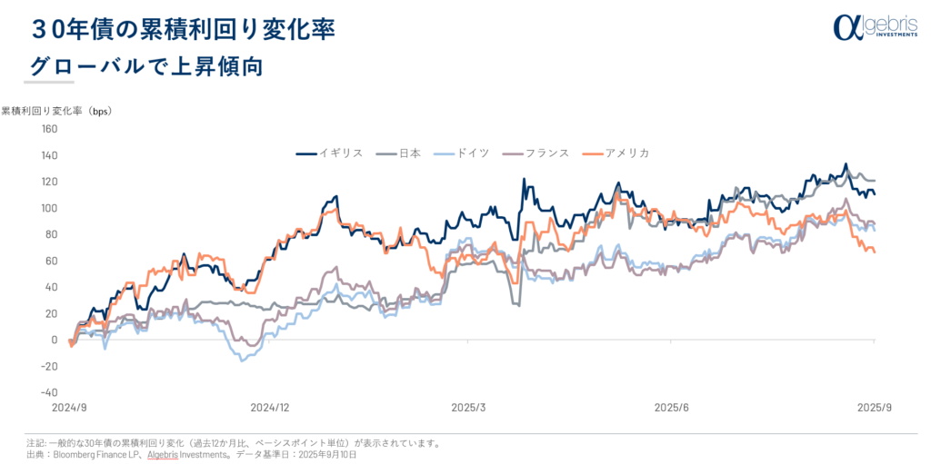 最近の英国で見られているように、財政不安が表面化すると、長期債の売りが特に顕著になります。この動きは英国だけでなく、世界的な現象になっており、各国で財政赤字が拡大している中、長期金利の再評価を促しています。背景には「成長は堅調だが、インフレ見通しは不安定」という状況があります。経済は悪くない状況ですが、インフレ見通しが不透明なため、財政赤字がより問題視されているのです。英国はその象徴的な存在ですが、米国の金利動向が世界の金利の方向性を決めるかもしれません。米国の長期金利が上がれば、他国もそれに引っ張られ、世界的に利回り(長期金利)がさらに上昇する可能性があります。