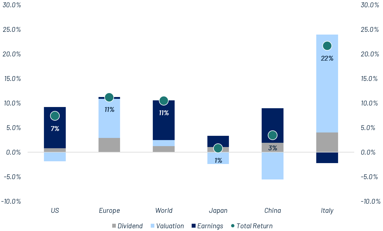 In contrast, Italy stood out with an impressive +22% total return during the same period. This outperformance was driven mainly by multiple expansion, reflecting a recovery from previously suppressed valuation levels, which had ranked among the lowest during the prior year.
