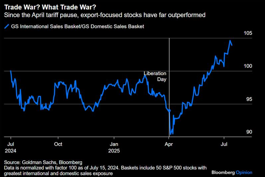 Therefore, a question arises: is Trump serious about tariffs? After the Liberation Day shock, Trump revealed a more benign attitude, hinting that the real goal is negotiation. As shown in the chart, this idea has been widely accepted by the market so far, as US-listed stocks most exposed to exports have far outperformed domestic focused companies ever since Trump’s backtracking on tariffs in April.