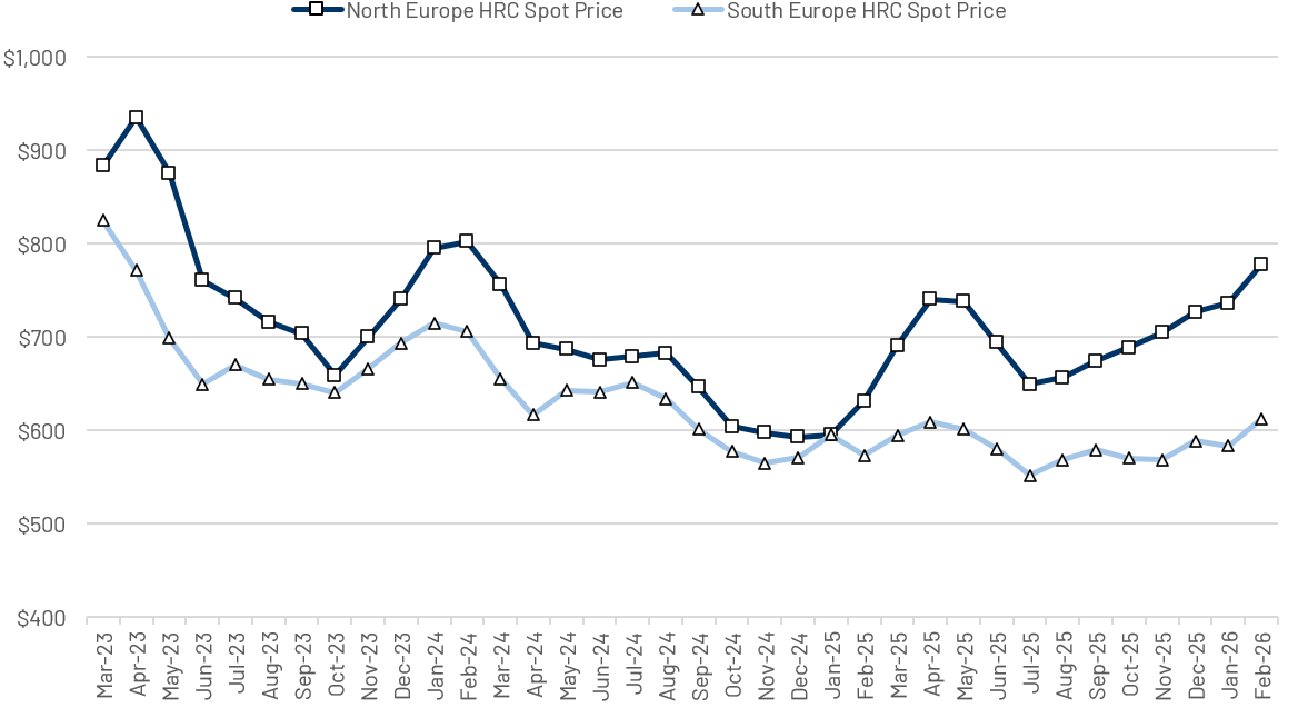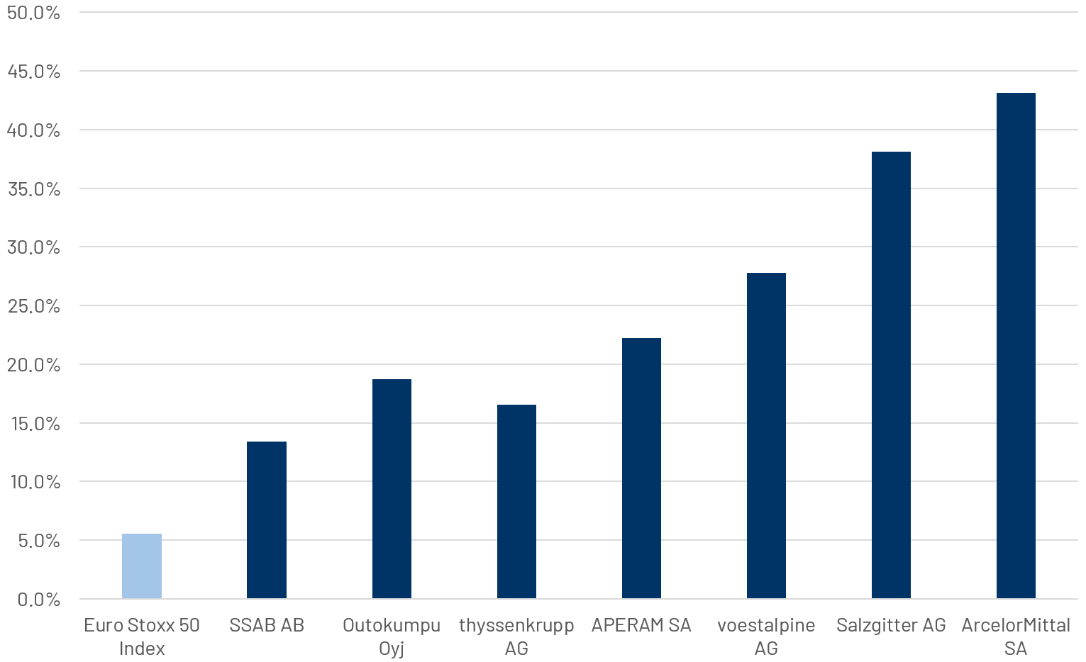 Europe’s steel industry has struggled in recent years due to weak demand, high energy costs, and rising import penetration. However, a recent shift in EU policy could improve the sector’s outlook. In October 2025, the European Commission proposed a much tougher trade regime, halving import quotas and doubling out-of-quota tariffs to 50%. At the same time, the roll-out of the Carbon Border Adjustment Mechanism (CBAM) is expected to increase the effective cost of non-EU steel, encouraging local sourcing and supporting higher European benchmark prices. This comes as the US, under President Donald Trump’s second term, has also strengthened protectionist measures to support its domestic steel industry, with tariffs on steel import up to 50%. The new European framework is expected to come into force in mid-2026 and could significantly reduce steel import penetration in Europe (which was close to 30% in 2025) while lifting prices. Markets have already begun to reflect this scenario: European hot-rolled coil prices are up around 11% year-to-date, and major European steelmakers stock prices are all up double-digit since the beginning of 2026, outperforming the Euro Stoxx 50 index.