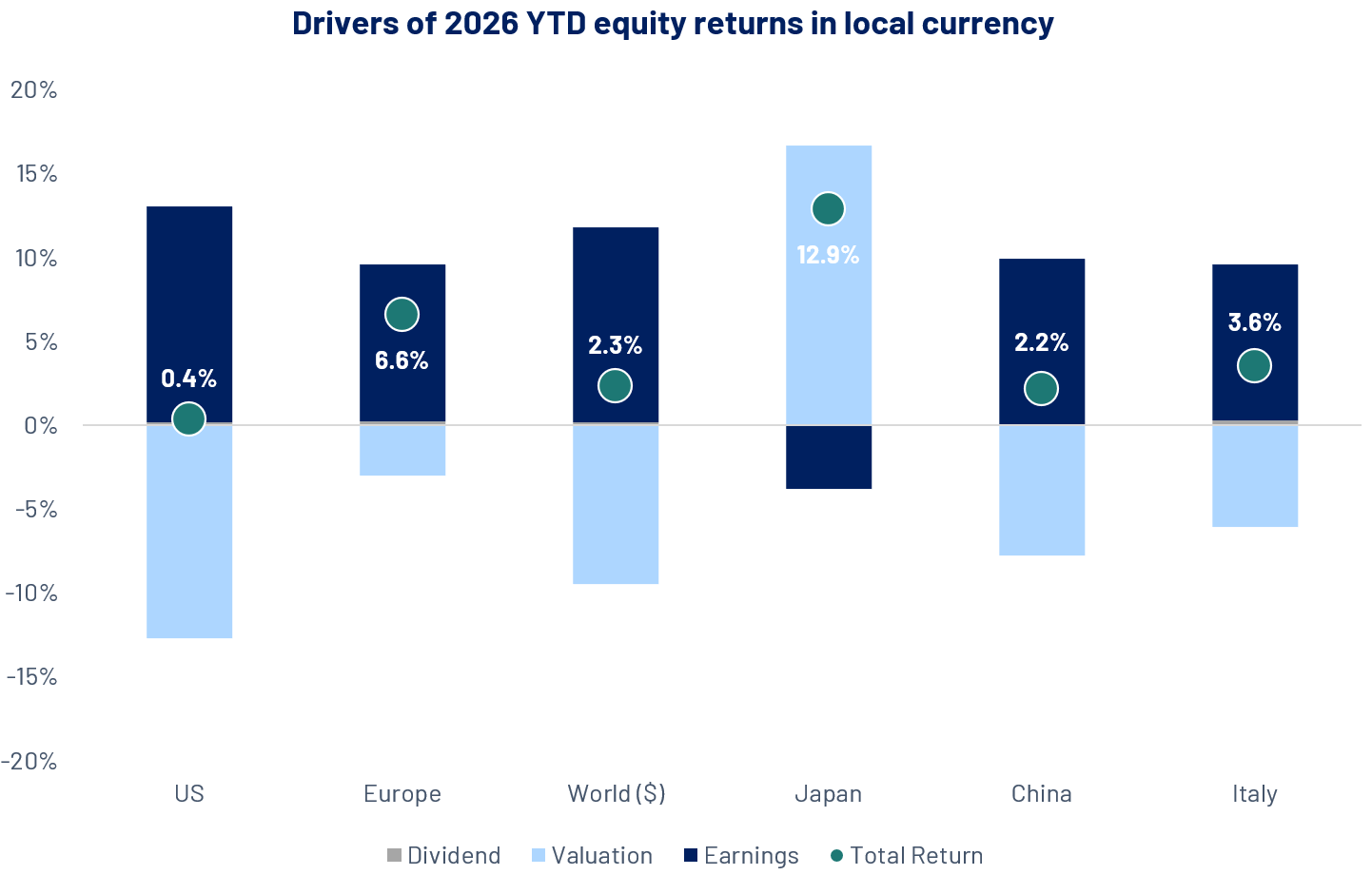 Global equities began 2026 on an upbeat note, with the MSCI World Index rising 2.3% YTD in USD terms. This performance was primarily driven by a global recovery in earnings, which was only partially offset by a contraction in valuations. Mirroring the trend seen in 2025, the US remained a laggard as global capital reallocation continued. We are seeing some outflows from US markets in favour of strong inflows into Europe, Latin America, and select Asian countries, even as underlying US earnings growth remains robust during the current reporting season. European equities, which surged over 20% in 2025 as valuations rebounded from historical lows, are now seeing a fundamental recovery in earnings, a trend that is also reflected in the Italian market. In Asia, Japan and Korea have emerged as standout performers. The Japanese index was bolstered by the recent re-election of Prime Minister Sanae Takaichi and her administration’s commitment to an aggressive fiscal expansion plan. Meanwhile, Korea’s tech-heavy index continues to benefit from the ongoing buildout of US data centres and the global demand for AI infrastructure.